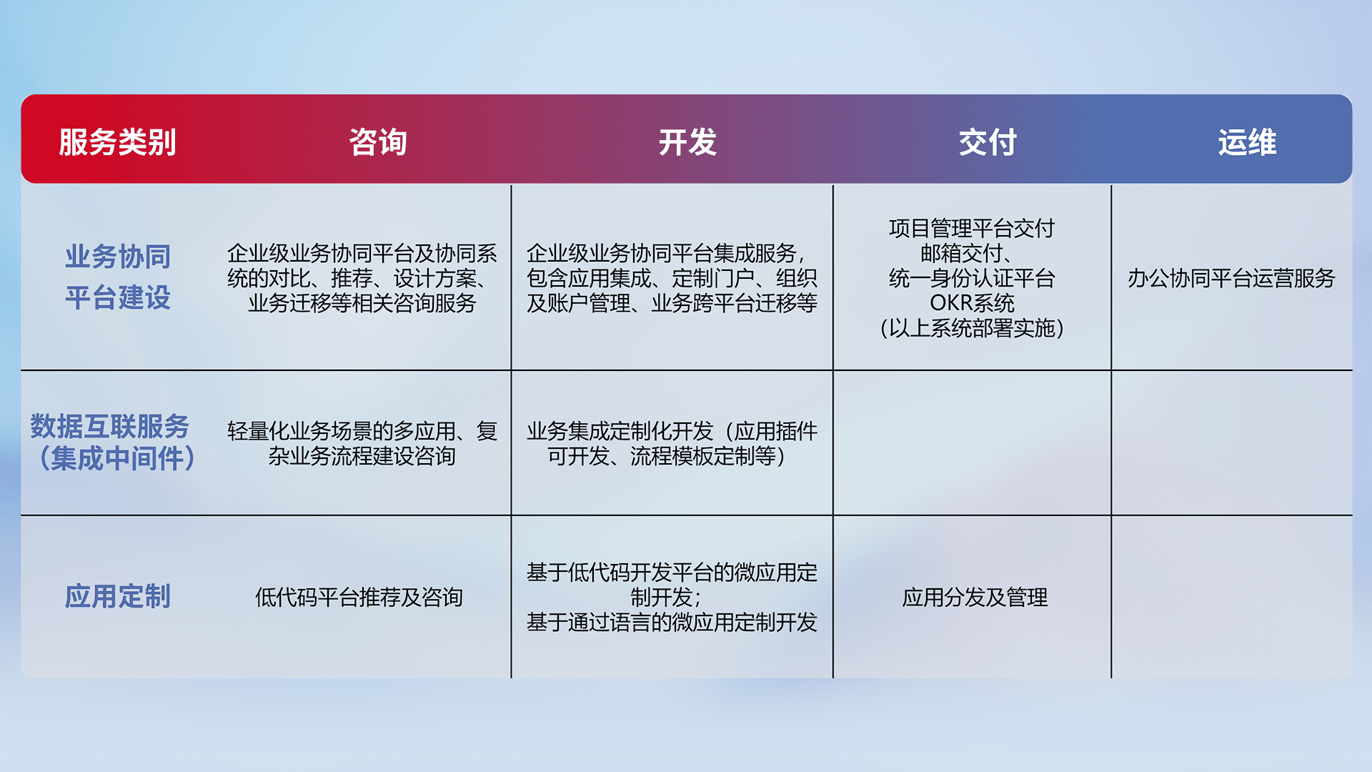 针对钉钉、、、、企微、、IDaas等平台级产品提供产品的规划、、、方案、、交付、、、定制化开发等服务,,,,实现如统一协同办公、、智能客户服务、、、混合会议管理、、、、智能数据查询、、、等业务场景,,,实现数字化转型。。