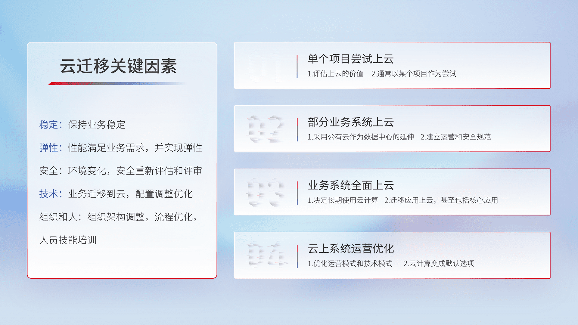 结合实际业务,,从规划设计、、、云平台选型、、、云原生改造、、、数据迁移、、、集成交付,,,,迁移全过程为客户识别最佳上云路径,,,,做好风险识别管理,,,,设计网络架构、、、身份权限、、、安全审计合规、、操作审计、、日志审计、、、监控告警策略、、、多站点容灾设计等,,,对云上基础设施进行整体规划,,,,提升IT治理水平,,,以满足弹性、、高可用、、高性能的需求。。。。