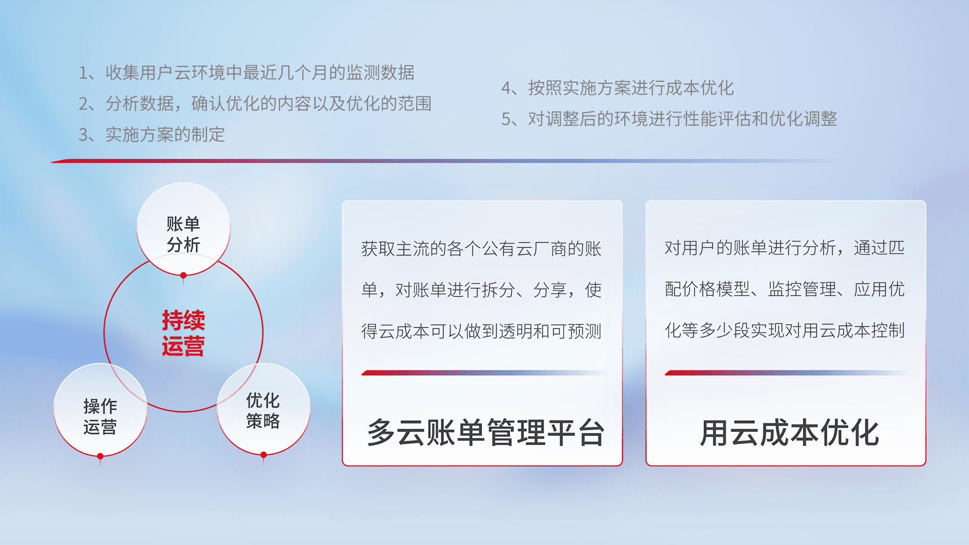 通过多云纳管,,,以统一的资源数据模型把客户的云资源进行抽象和封装,,,进而实现对多云资源的统一操作,,保障云资源管理的可靠性、、稳定性与可用性。。。。量身定制化运维内容,,,,配置、、、开发运维、、、、补丁管理、、、备份、、、、监控、、、、认证和访问管理、、、、审计和日常巡检等,,,保障在用云过程中的可靠度,,,,稳定度以及高可用率。。。。